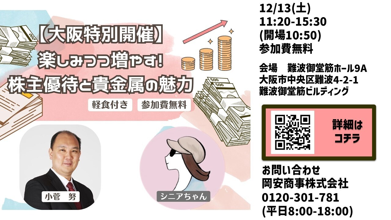 金融商品取引サービスを提供する岡安商事株式会社(本社:大阪市中央区、代表取締役社長:杉本良隆)は2025年12月13日(土)、大阪市中央区・難波御堂筋ホールにて、特別セミナー『楽しみつつ増やす! 株主優待と貴金属の魅力』を開催します。